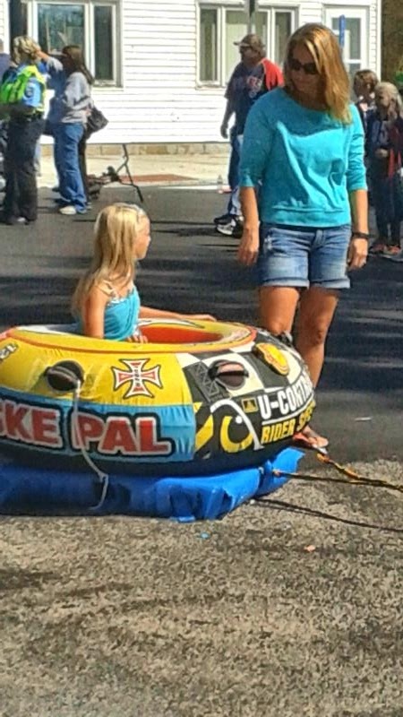 Lots of local businesses had floats too. Noble RV had a huge, brand new bus/RV, the drilling company had a giant truck, there were tractors and more. This little gal was riding a cushion of air instead of water behind a big boat.